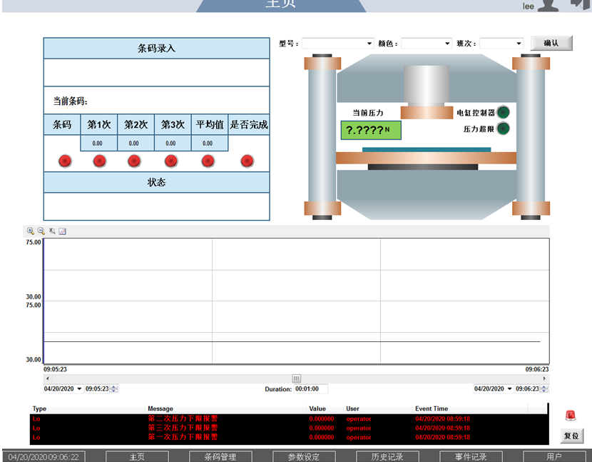 软件工作流程 登陆系统:以管理员或者工程师权限登陆系统。 配置参数:设置最小压力检测值,压力测试等待时间,第一步等待时长,条码序列号长度,压力超限值等等。 配置条形码的组成元素:条形由车型,颜色,班次和日期等因素组成,管理员需要配置这些信息。 扫码执行压力检测:用户需要在首页扫描框中,扫入条码,系统自动执行平整度检测。饲服电缸顶端3次按压检测部位,测试每次压力值。 查询检测结果:检测完成后,用户可以直接在首页查看检测结果。 打印报表:用户可以查询指定日期范围内的检测数据,导出PDF报表。