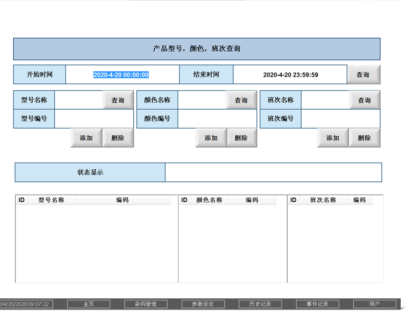 条码管理 条码中包含了5种有类型的数据,对于其中较为稳定的部分,比如,车型,颜色,班次进行维护。 A17769079007H46B1706200001,这是一个标准条码,其中A1776907900表示车型信息,7H46表示颜色编码,B代表班次,170520代表日期,后面00001代表产品编号。 参数设置 设置压力传感器检测的最小压力值,压力超限值,按压持续时间等等。 |