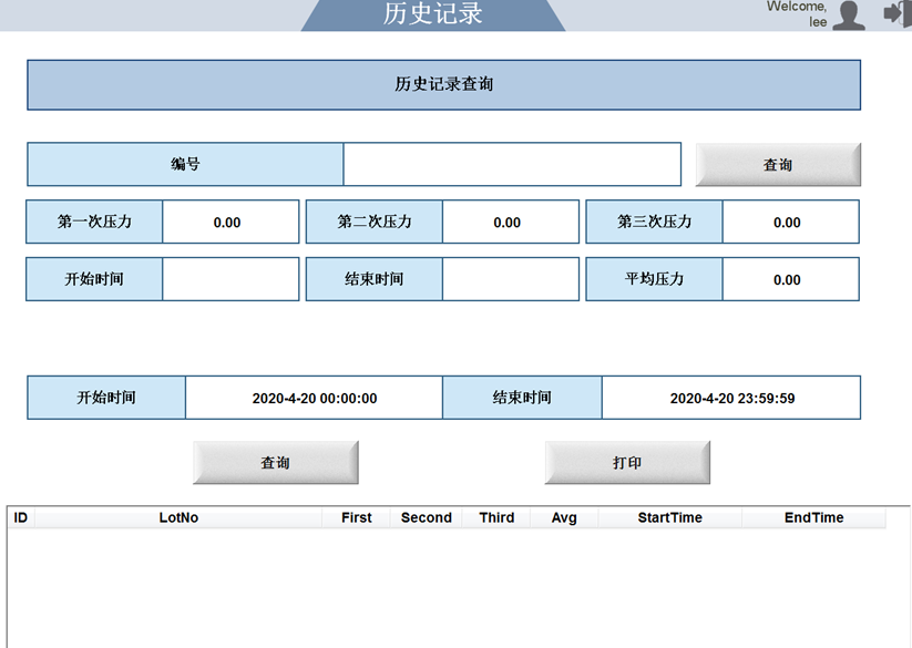 历史记录 利用条码或者时间查询压力测试数据。 可以查询该条码的车顶棚是否检测过。 输入开始时间,结束时间,点击下方的“查询”按钮,如果有记录,则占击“打印” 按钮,可以打印PDF文档。 事件记录 显示人员的操作记录